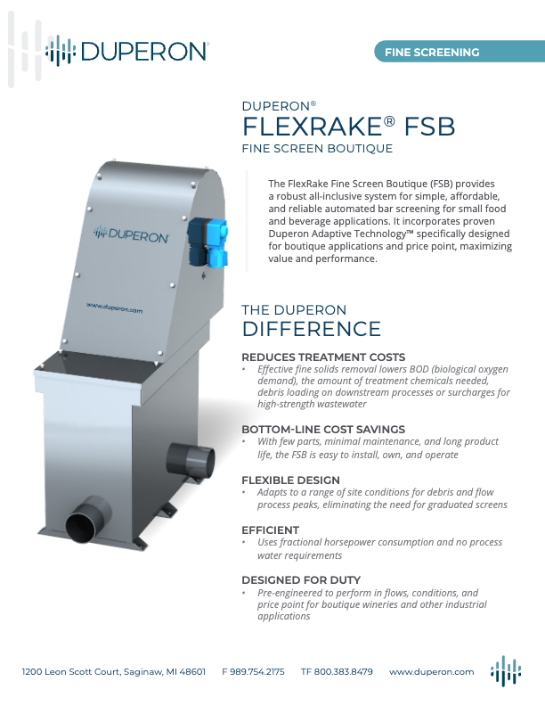 The FlexRake Fine Screen Boutique provides a robust option for simple, affordable, and reliable automated bar screening for small food and beverage applications. It incorporates proven Duperon Adaptive Technology™ specifically designed for this application and price point, maximizing value and performance.